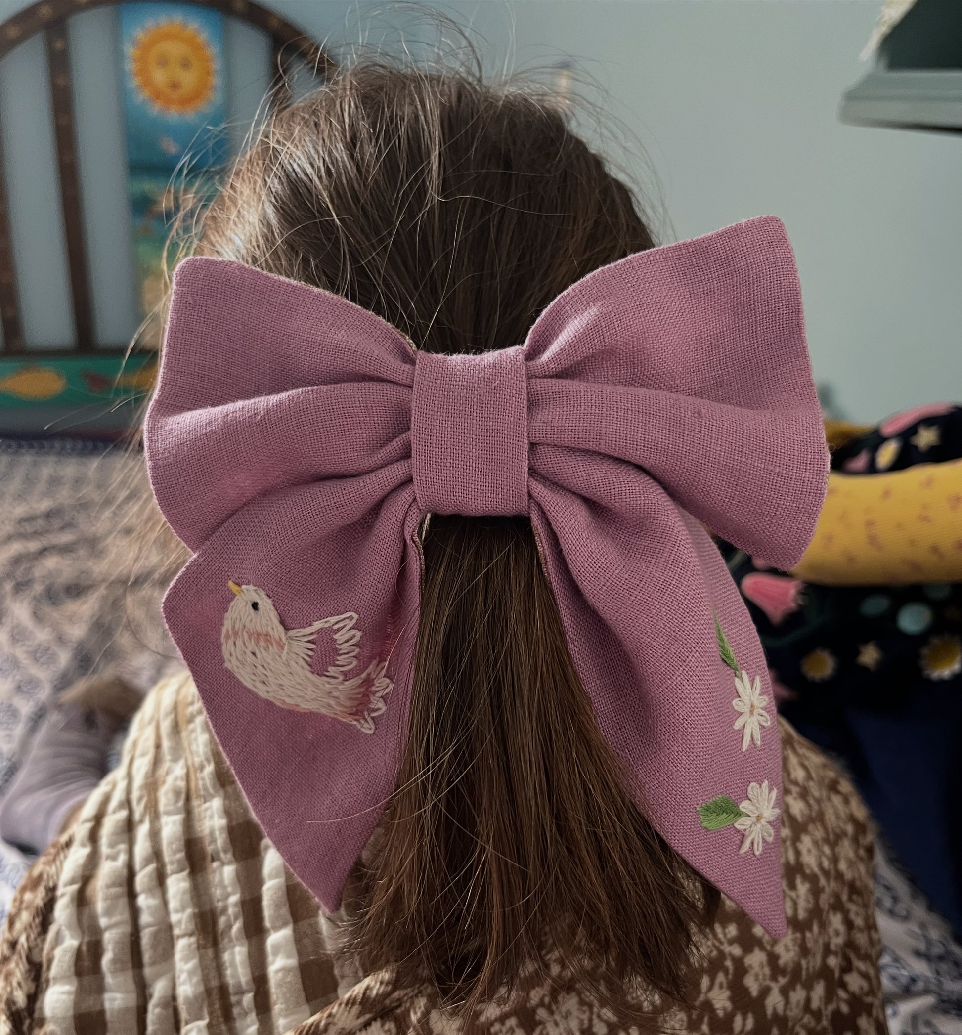 Big Linen hair bow lined in block print cotton. This can either have a crocodile clip, barrette clip or be finished with a ribbon to tie on a wreath.