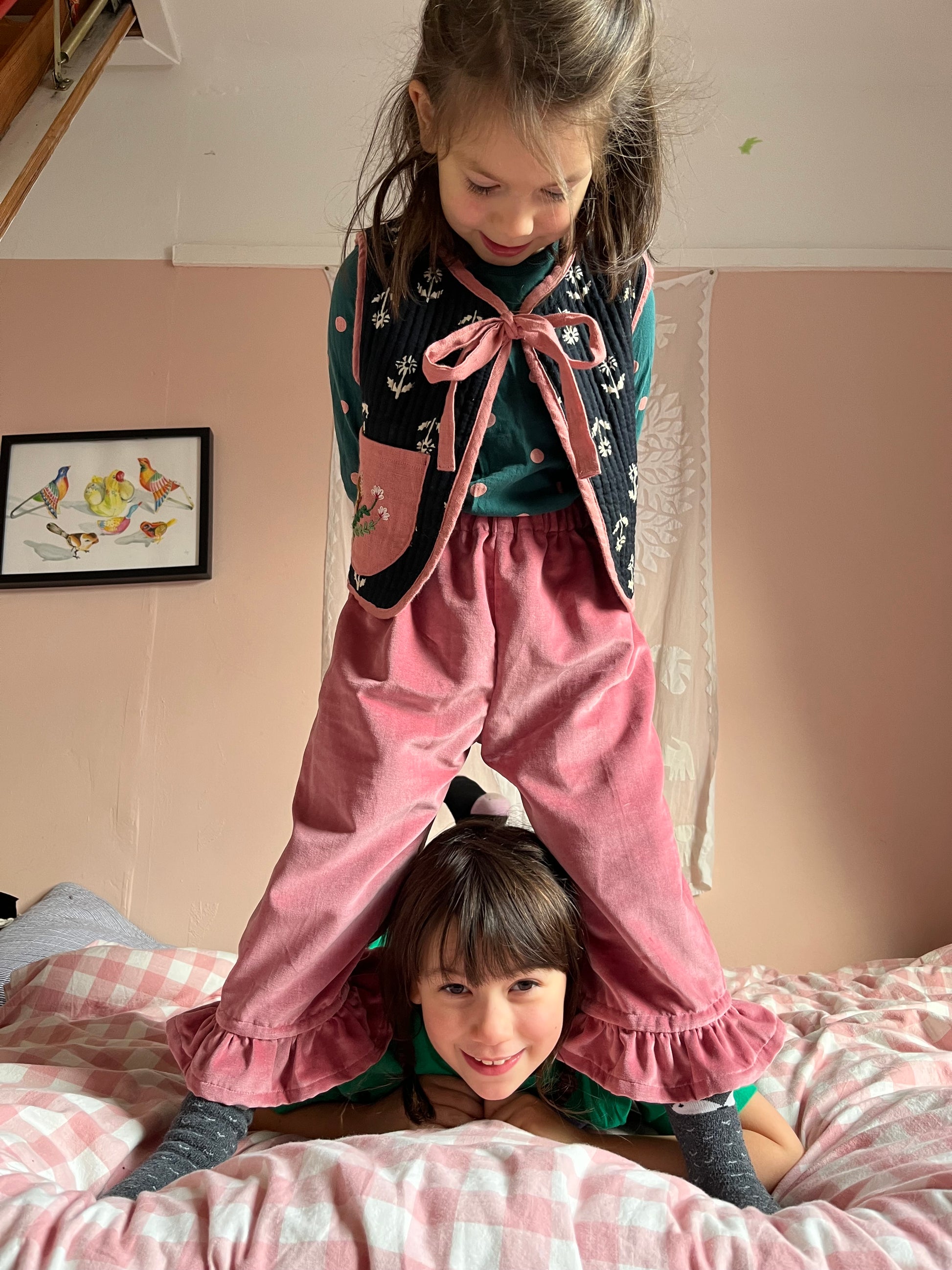 Beautifully soft cotton velvet trousers in our popular Daisy frill shape. These are perfect for parties and celebrations. Super comfortable and pretty too. The pocket embroidery can be chosen by you.