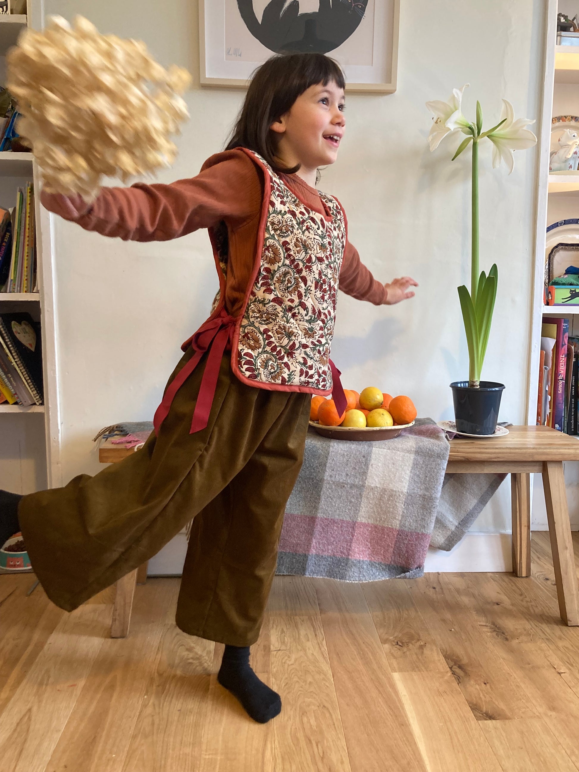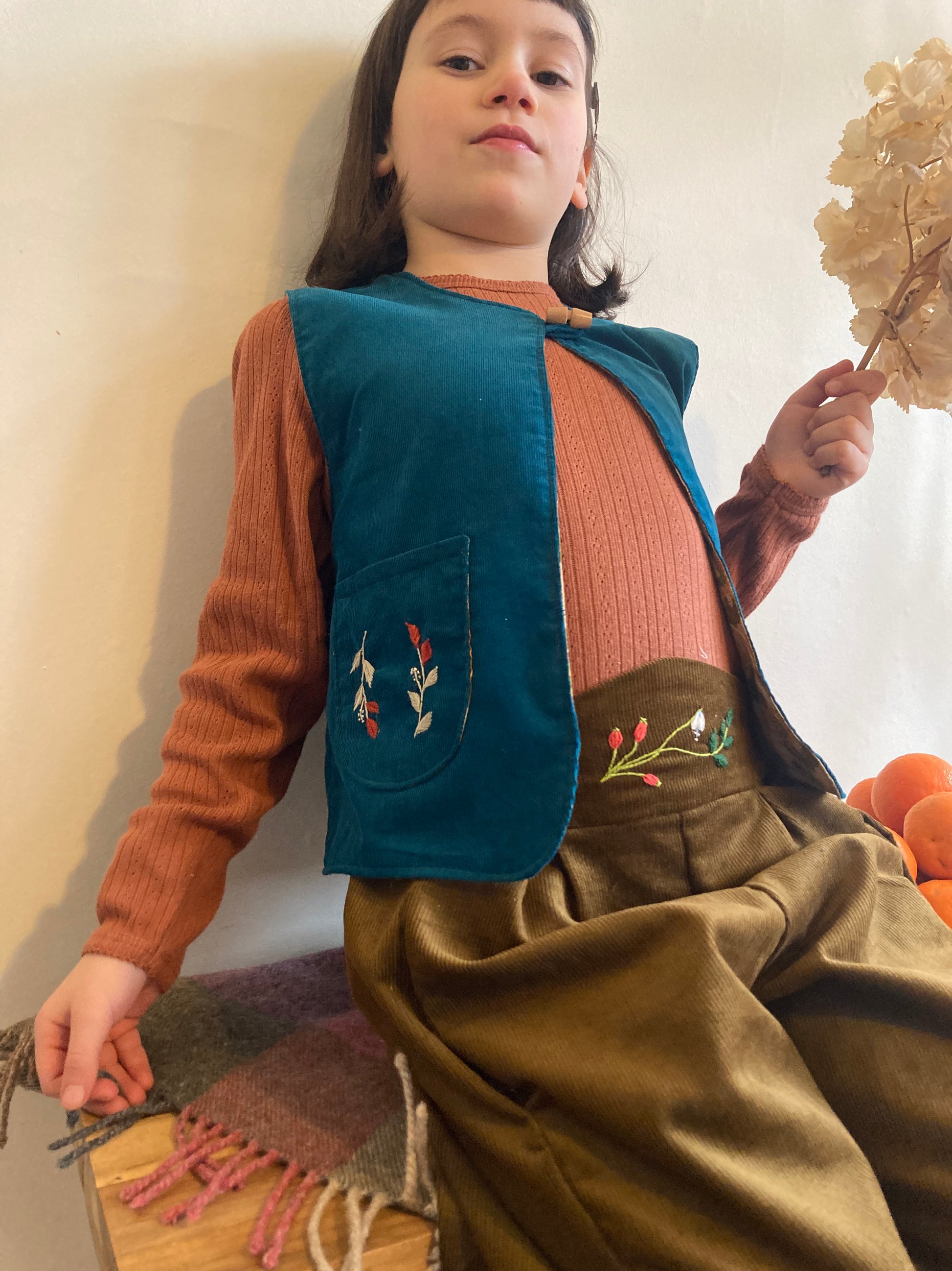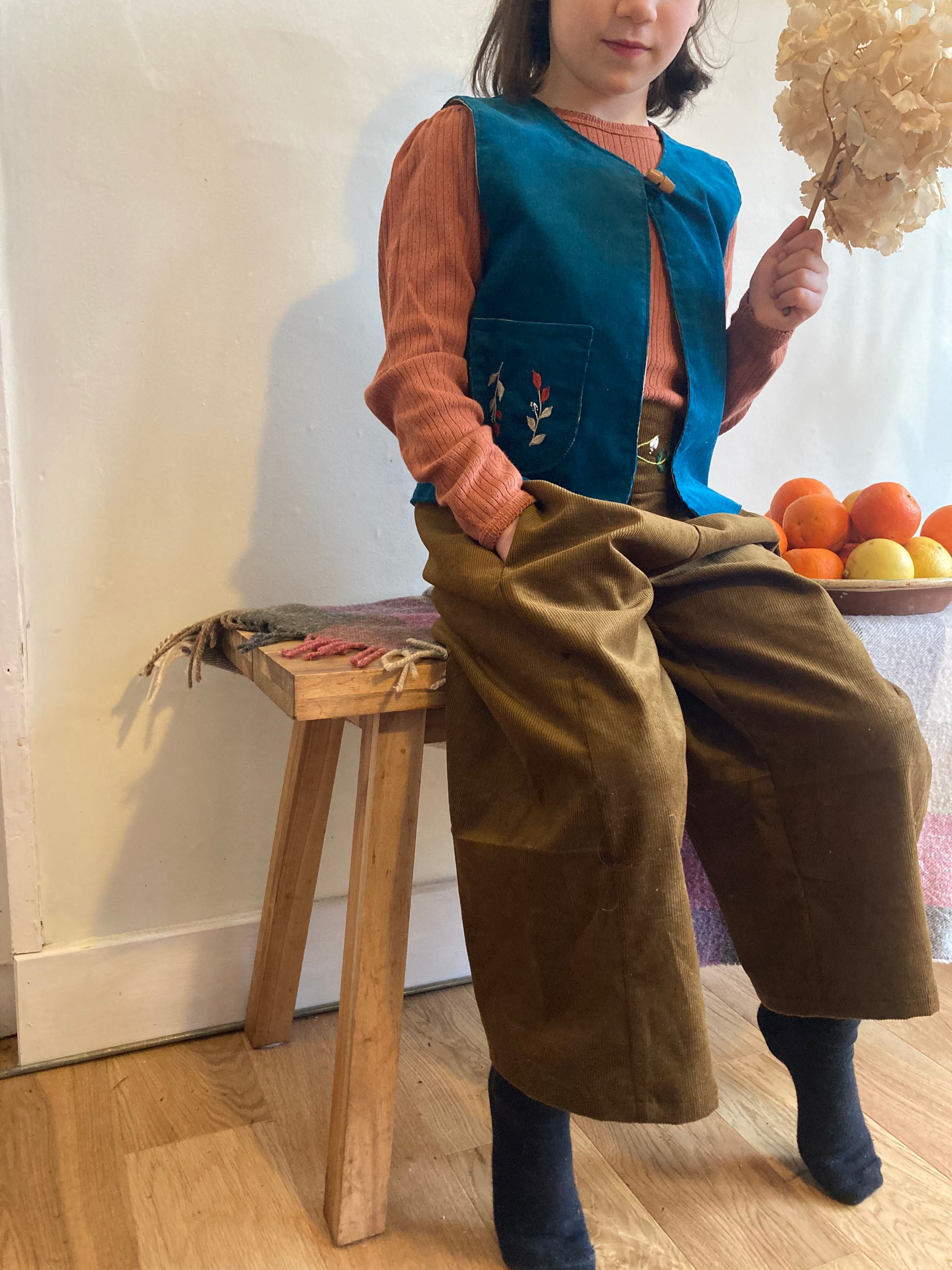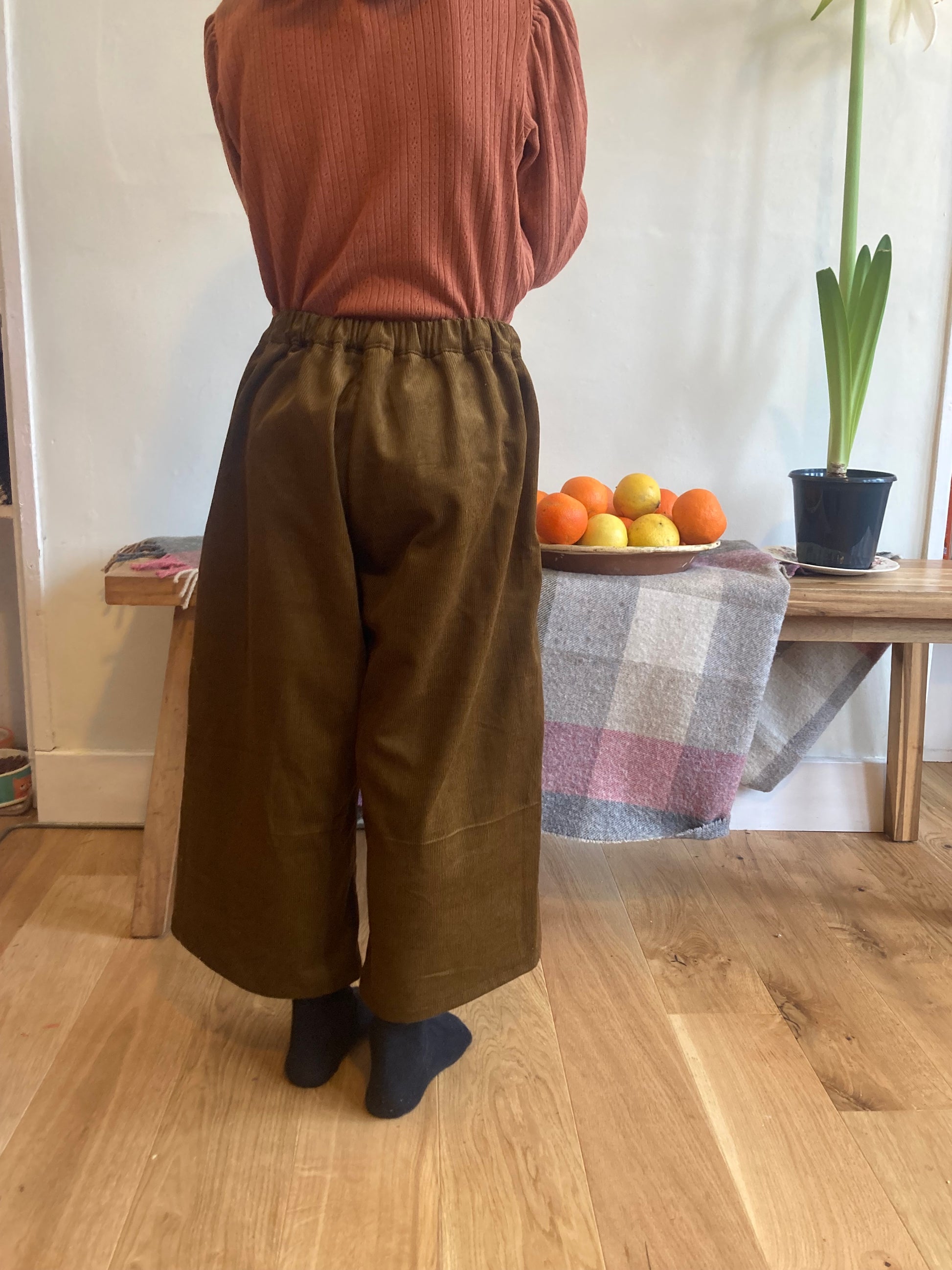 Buttery soft organic cotton corduroy culottes with wide hand embroidered front waist panel. These sit at the ankle for a stylish wide leg cropped look. Designed with comfort in mind, with back elastic at the back for easy pulling on and french seams throughout. Hidden in seam side side pockets.