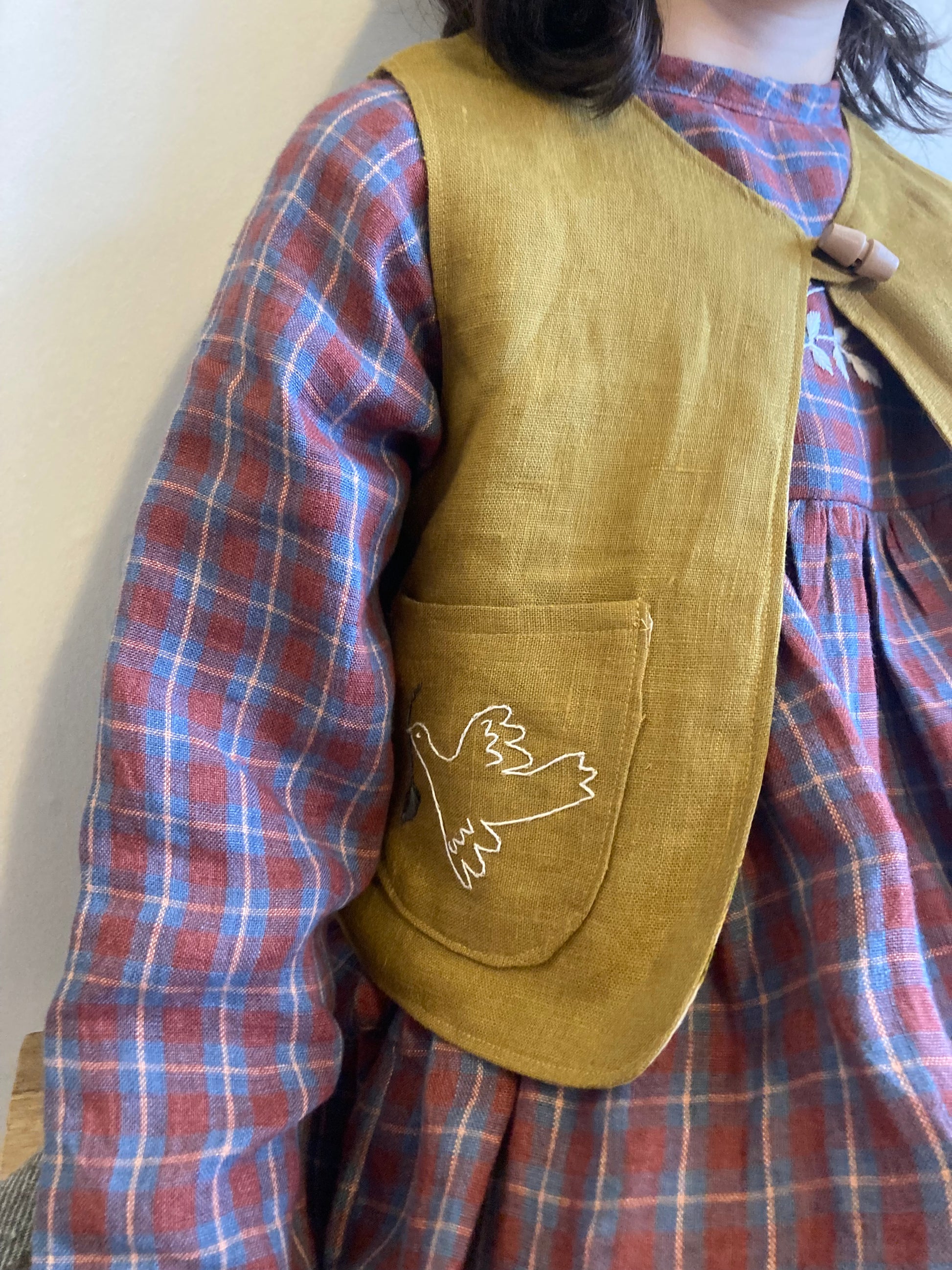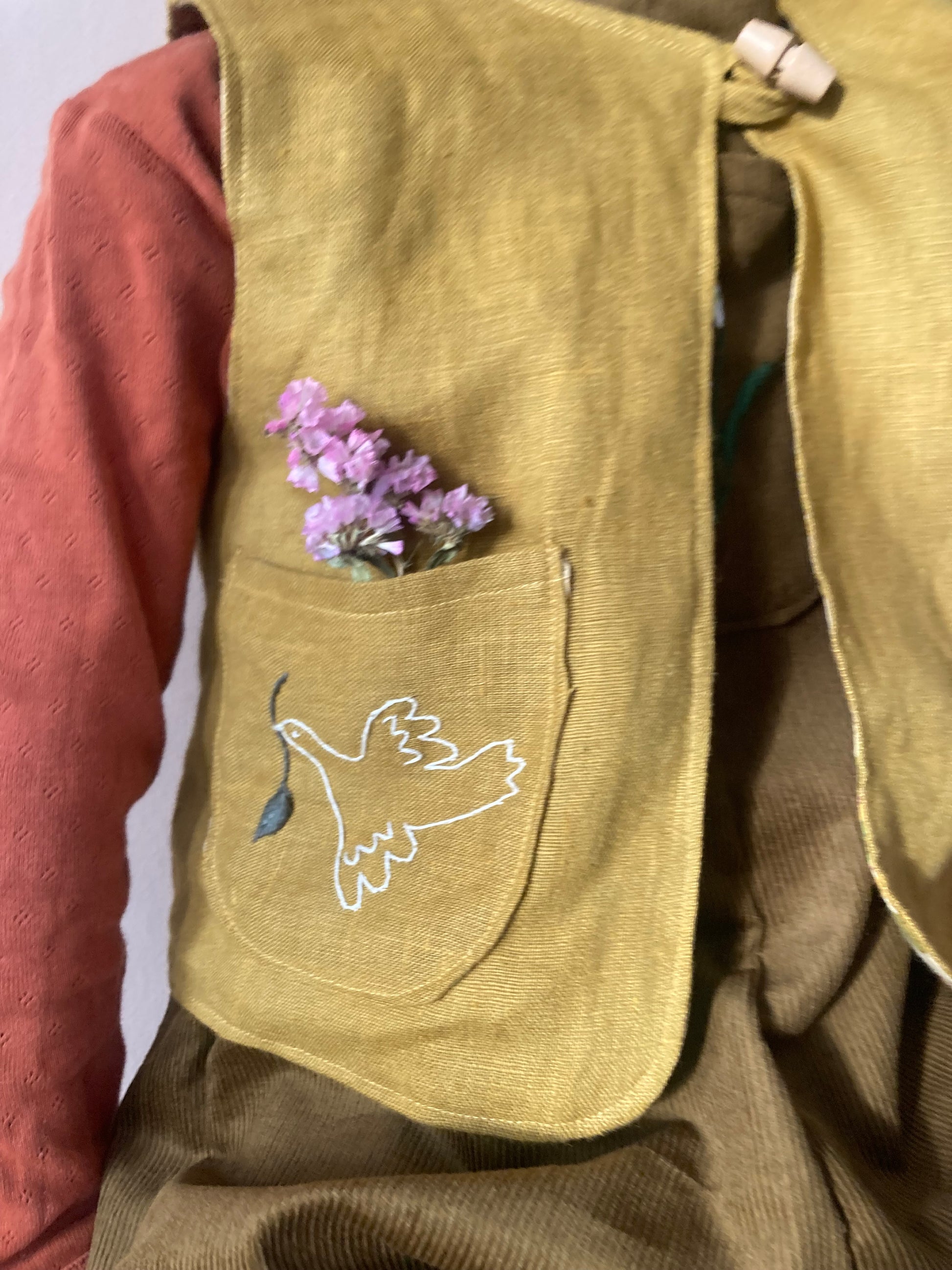 A waistcoat lined in cotton block print with a hand embroidered pocket featuring the peace dove motif. The waistcoat is fastened with an olive wood toggle.