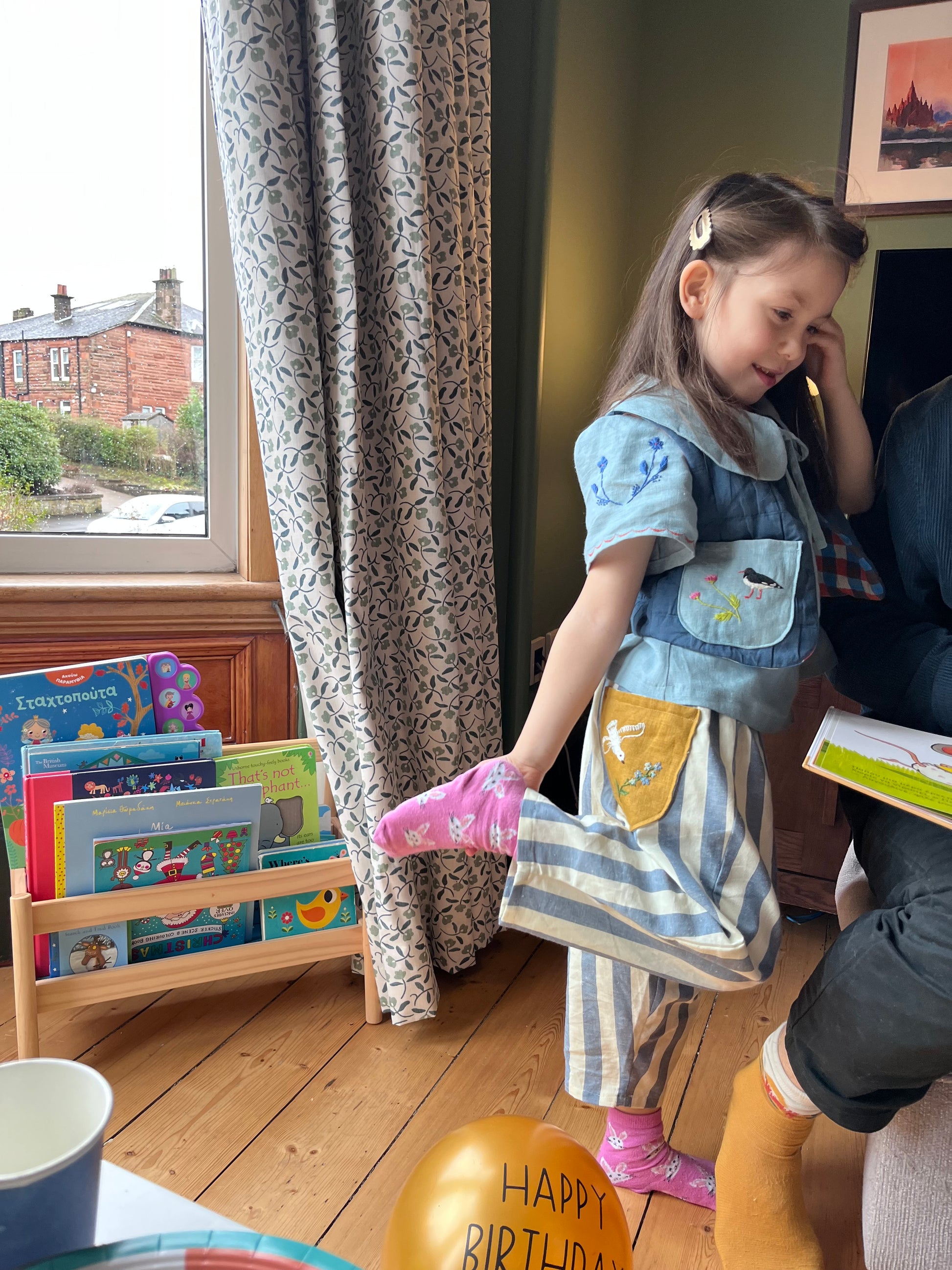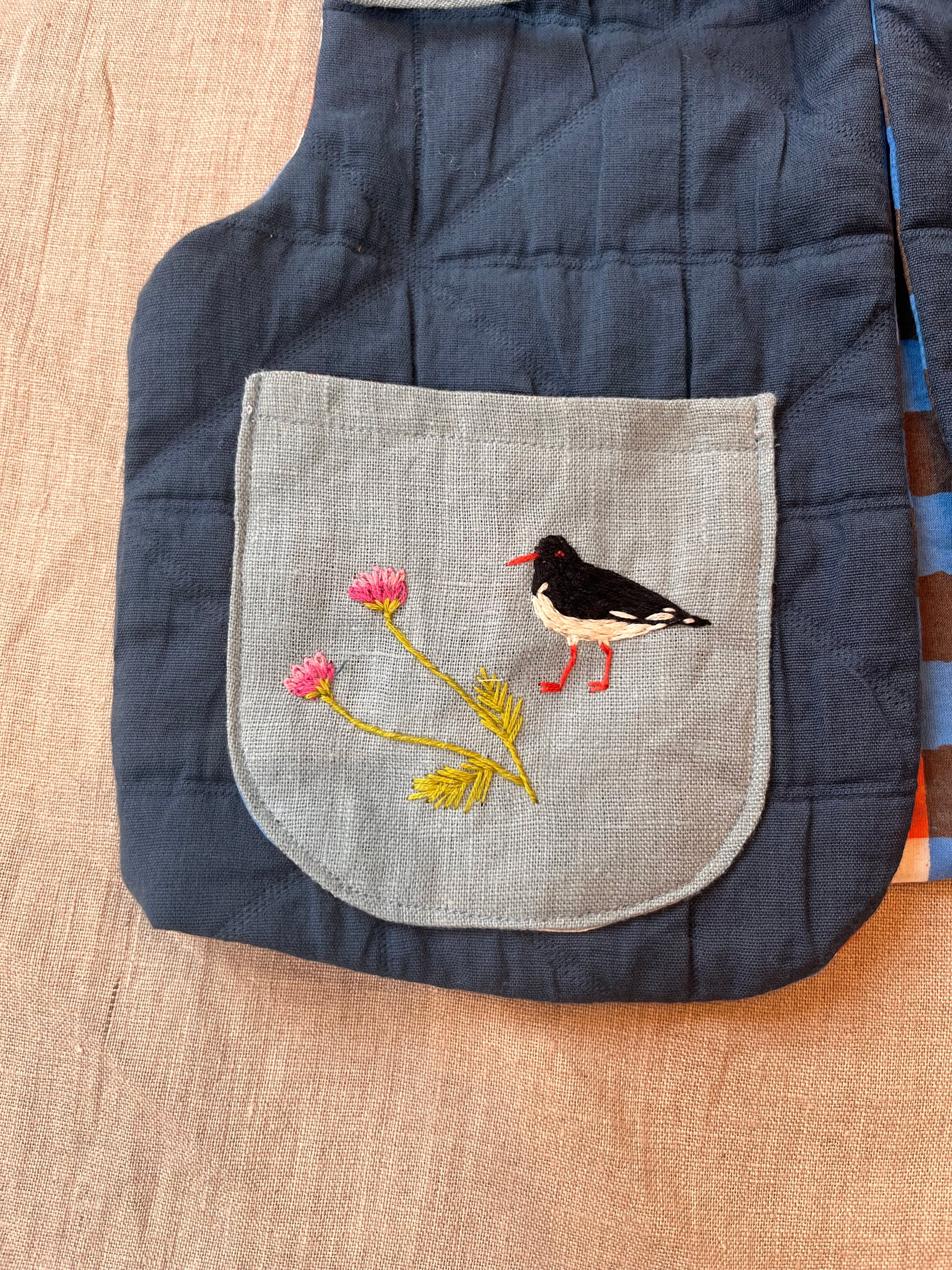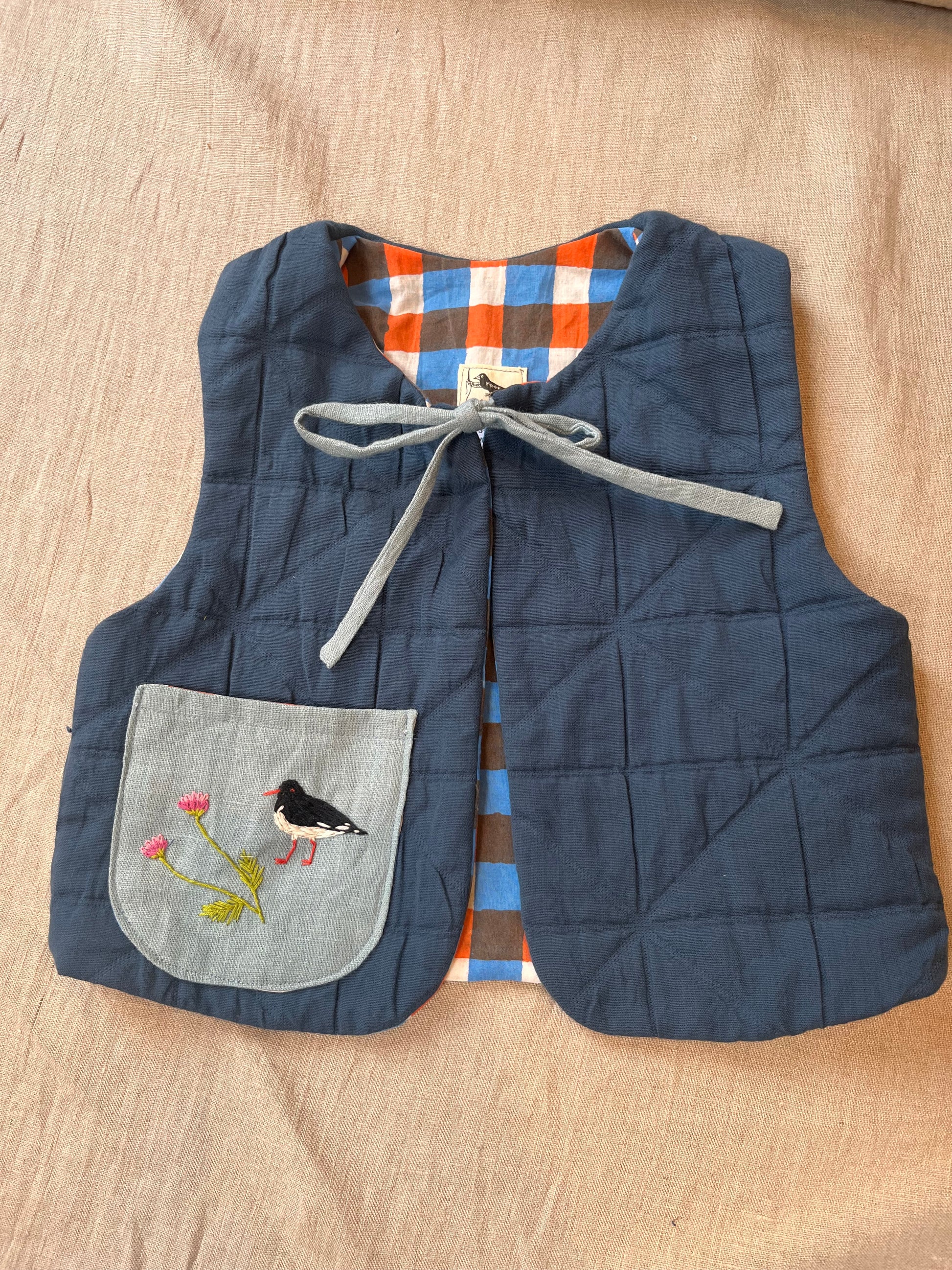 Made in organic cotton quilted jacquard with cotton block print lining this is a lovely seasonal piece to keep bodies warm in the spring breezes!