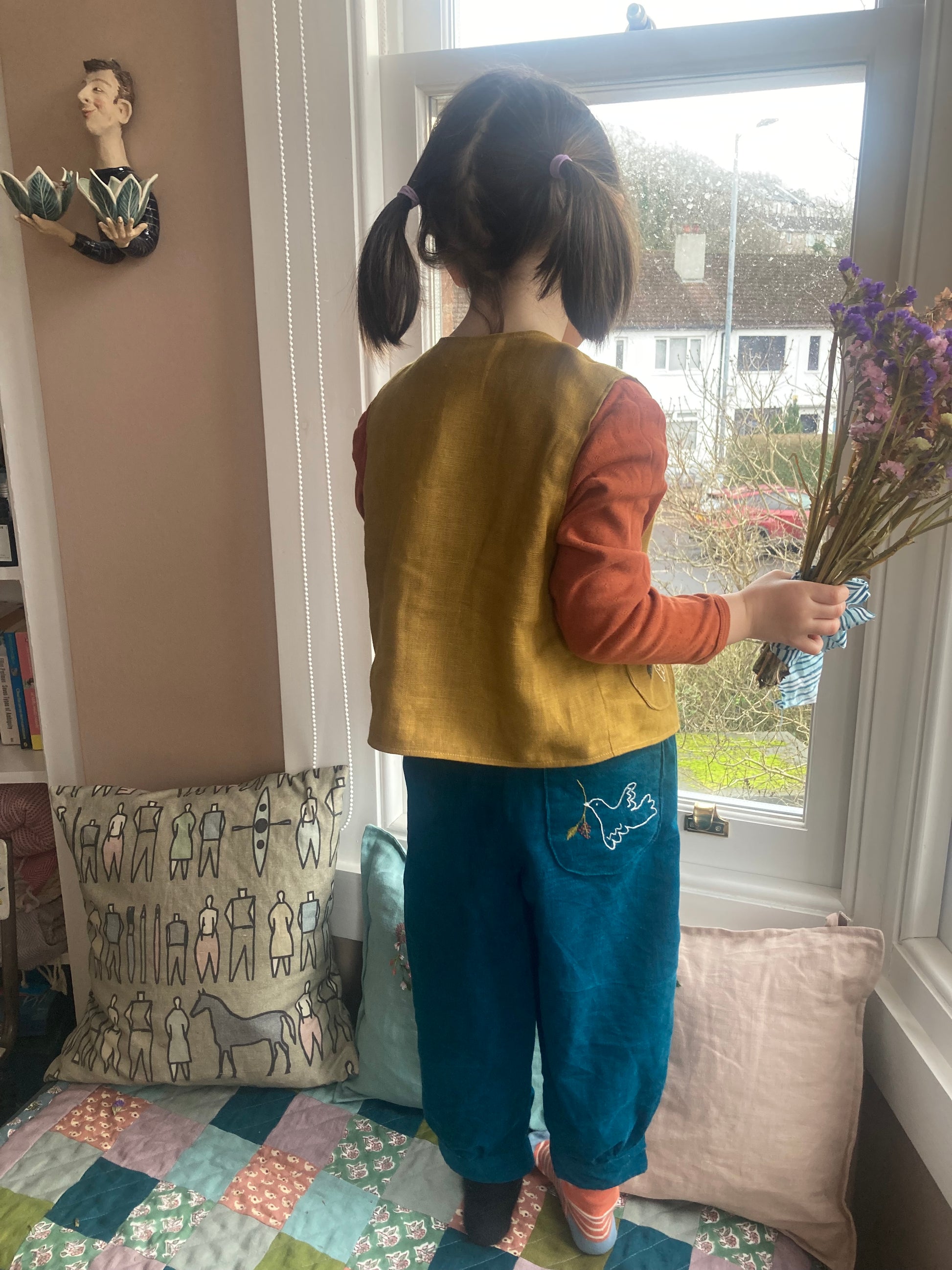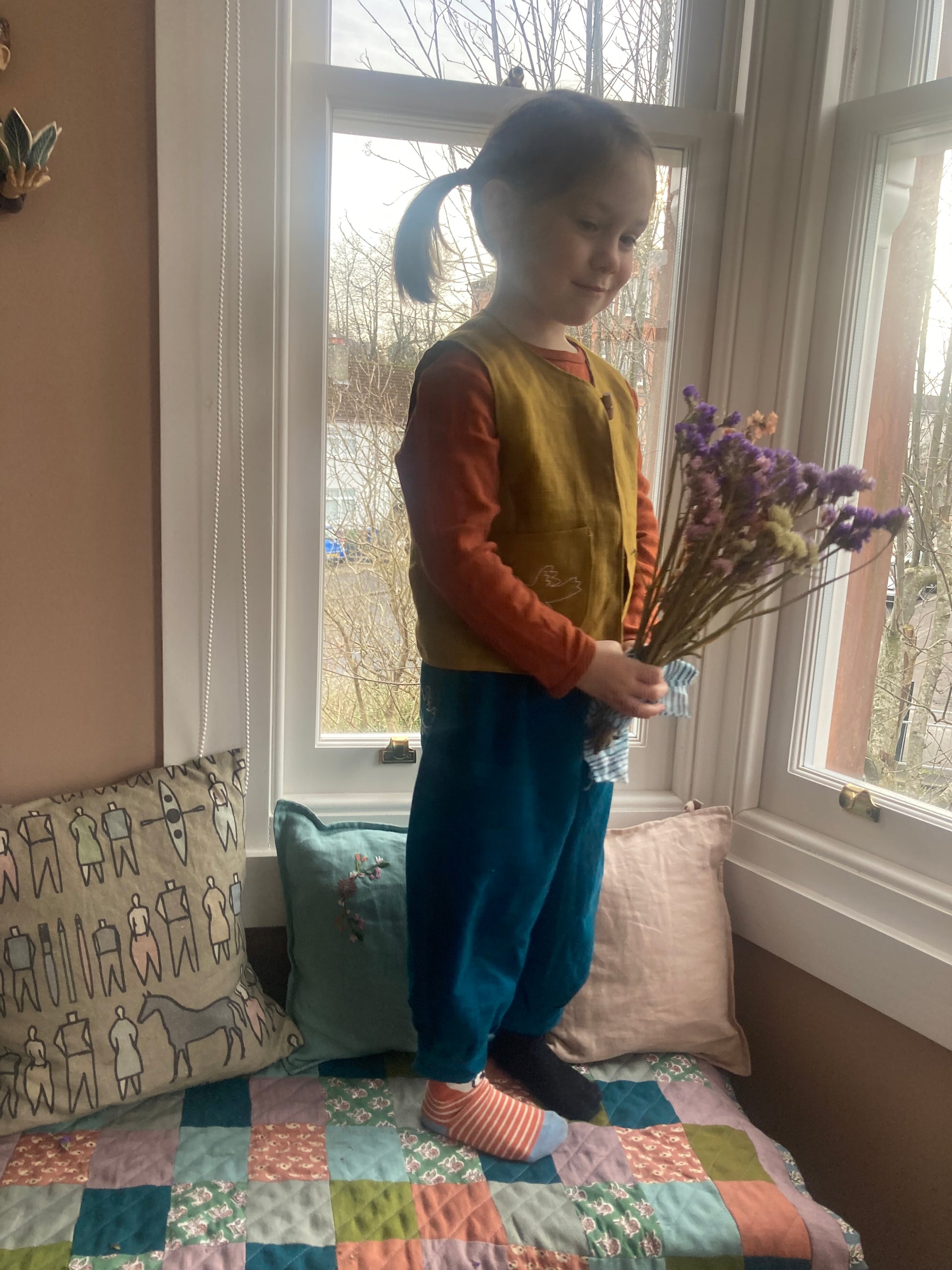 Embroidered with this season’s dove motif these are a comfortable and easy to pull on cosy pair of soft organic cotton corduroy trousers. They are cuffed at the ankle but have plenty room to get your foot in!