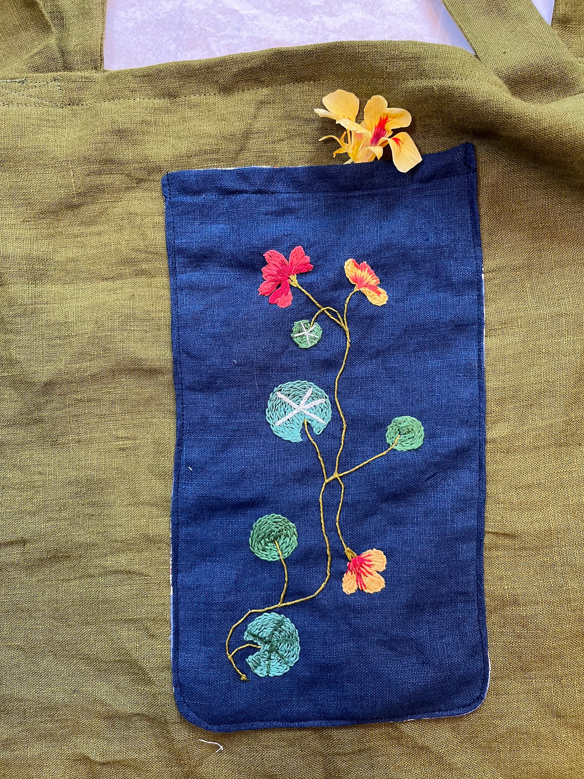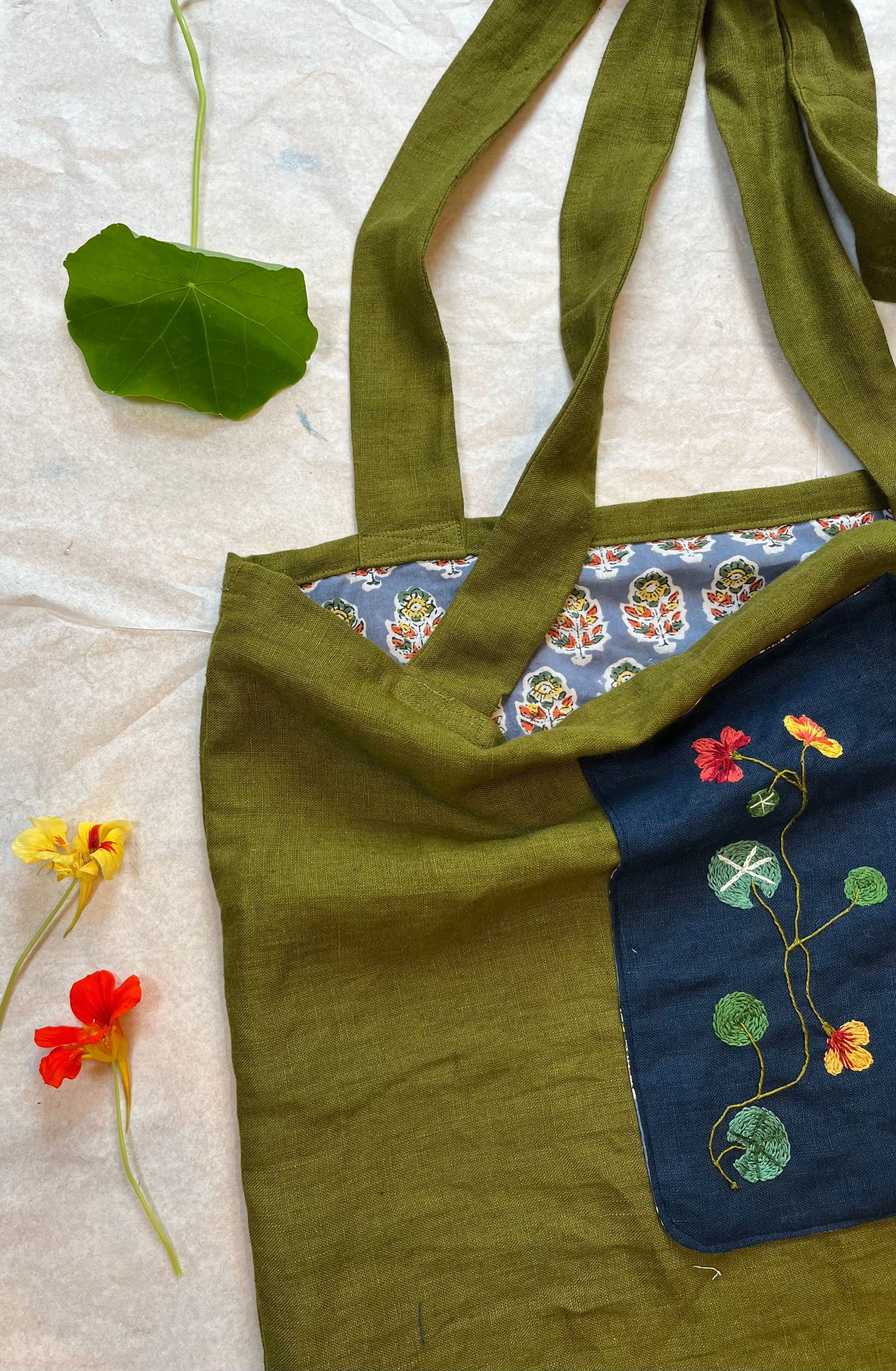 Pretty for a picnic, ideal for the every day. This is an oversized tote, ideal for grabbing some shopping, slinging on a beach adventure or taking to the park. The bag features a large hand embroidered outer pocket with our signature nasturtium design and is fully lined in beautiful Indian cotton block print. It has an internal pocket, perfect for holding a phone or wallet.
