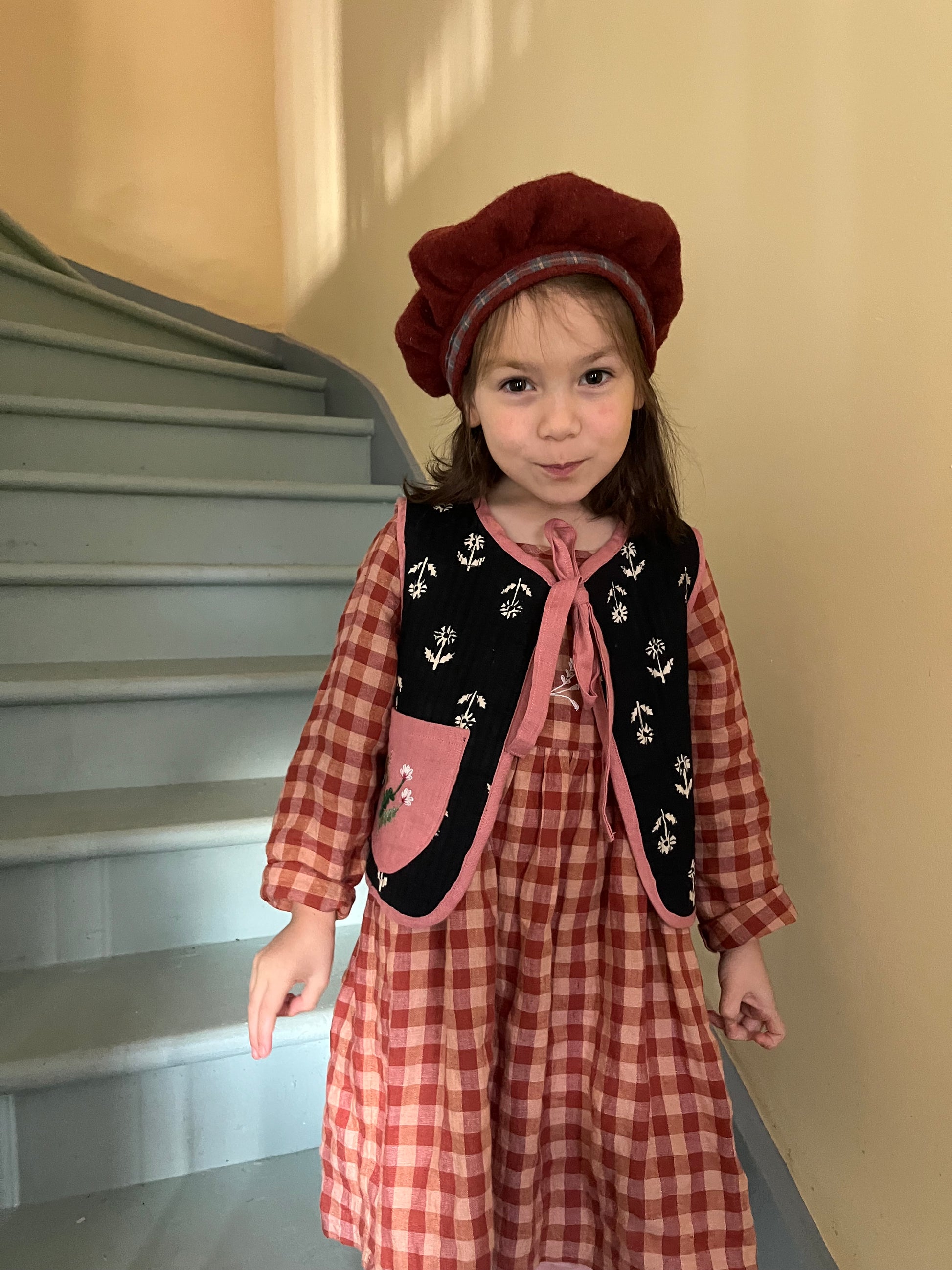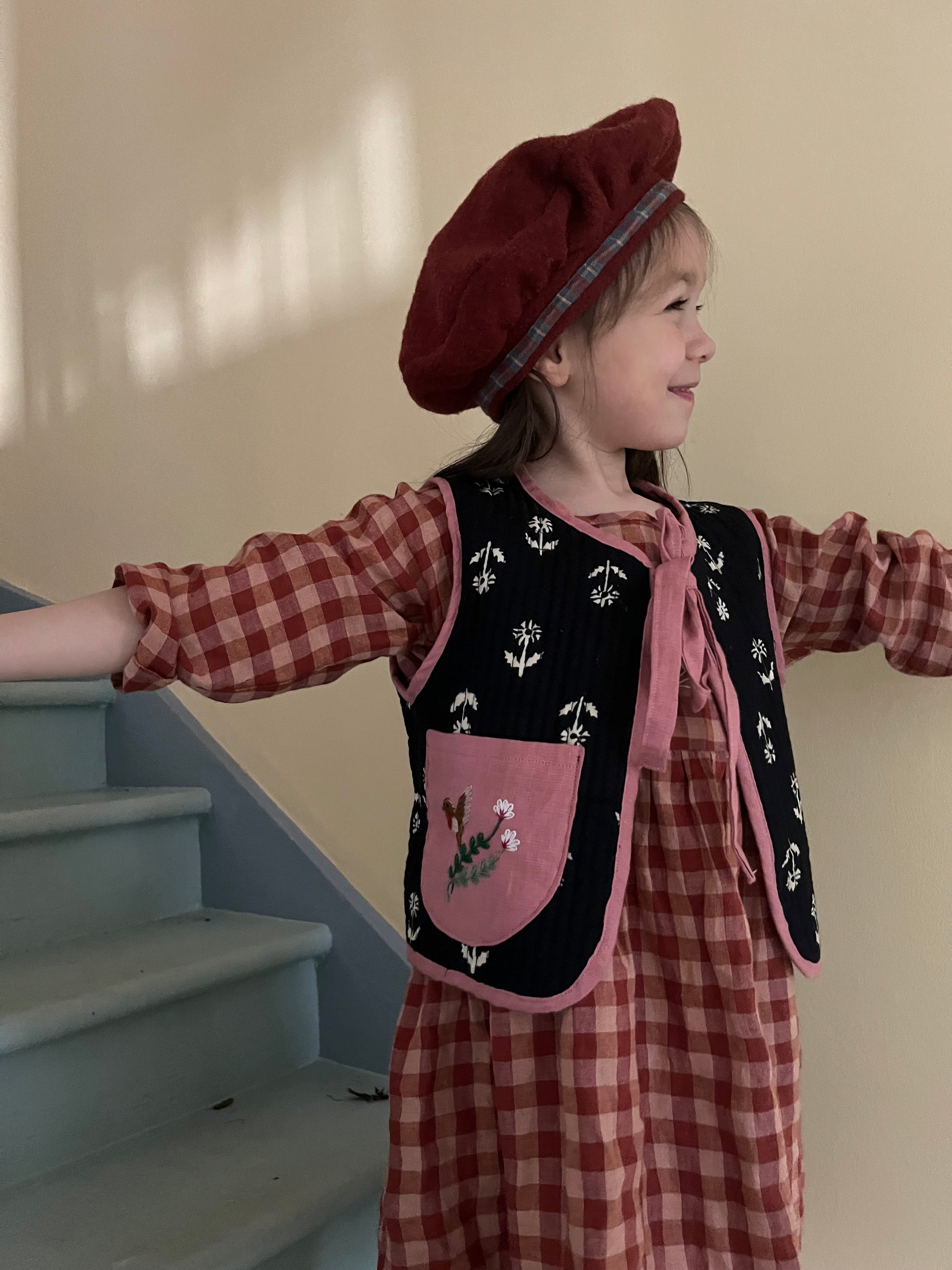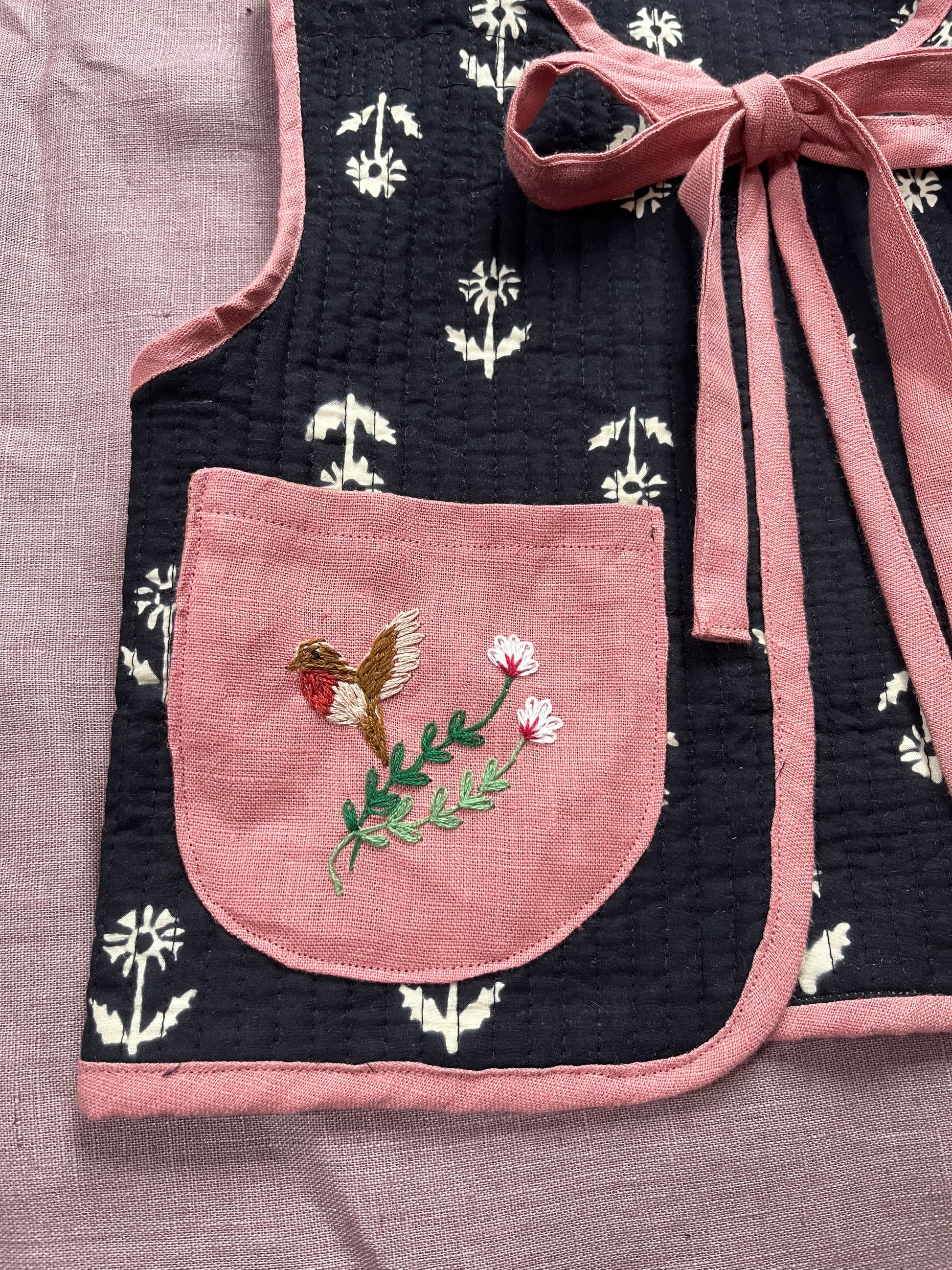 Stunning quilted block printed cotton vest bound with linen. This is a piece to keep you cosy and instantly stylish with hand embroidered pocket and a lovely linen bow to tie.
