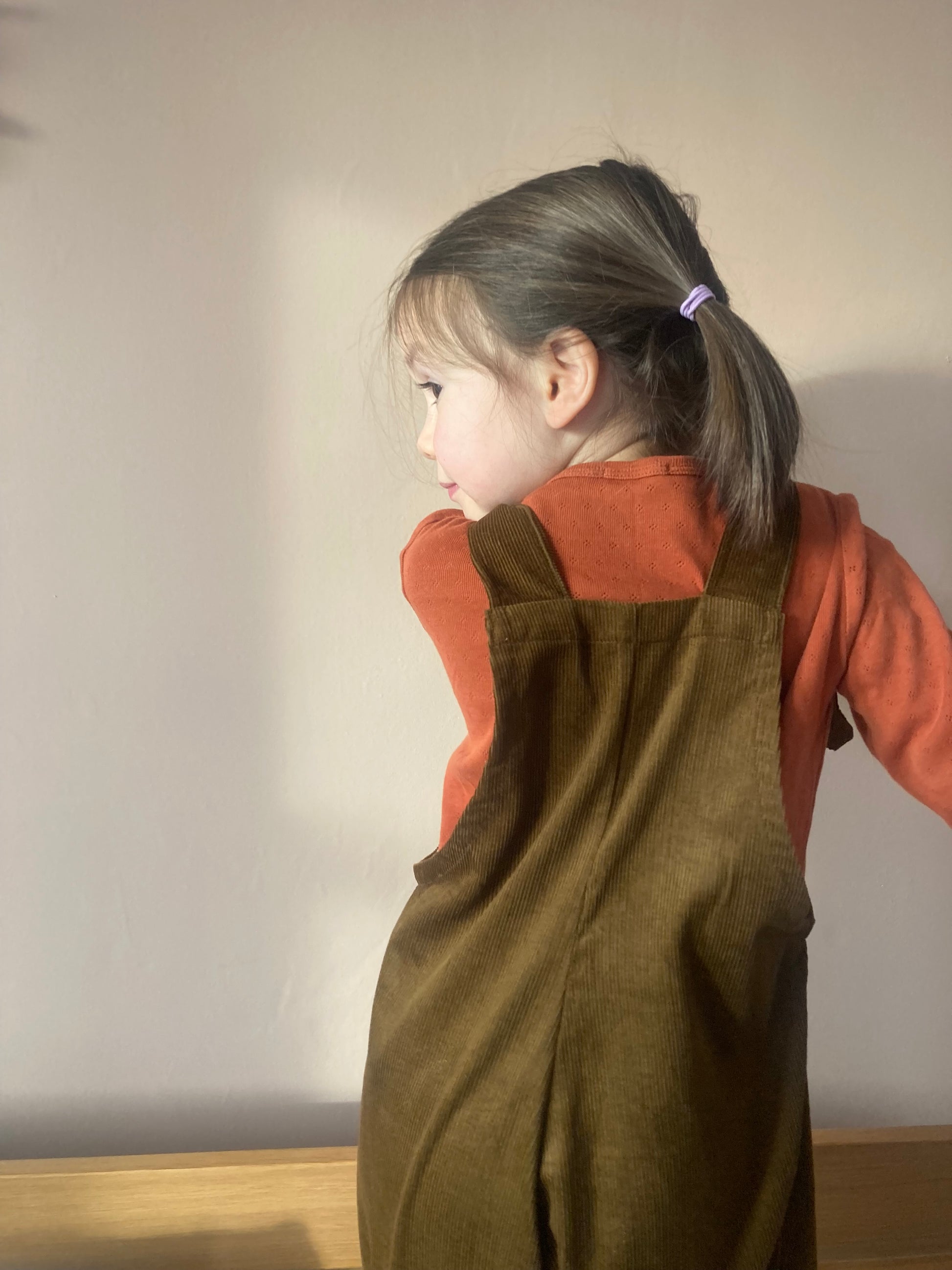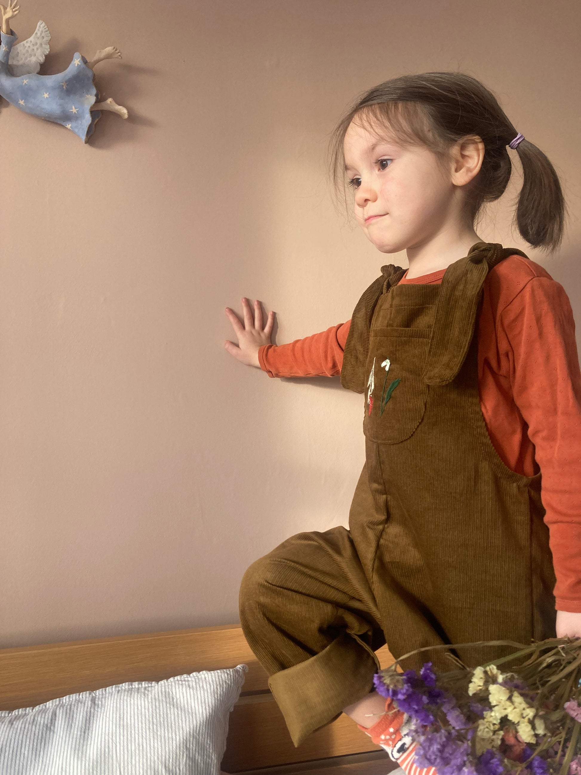A classic pair of unisex organic cotton corduroy dungarees to romp around Autumn and Winter in. These are a comfortable easy going shape. Plenty of growing room and adjustable tie straps. The pocket can be made with bespoke embroidery of your choice so get in touch to request when you order.