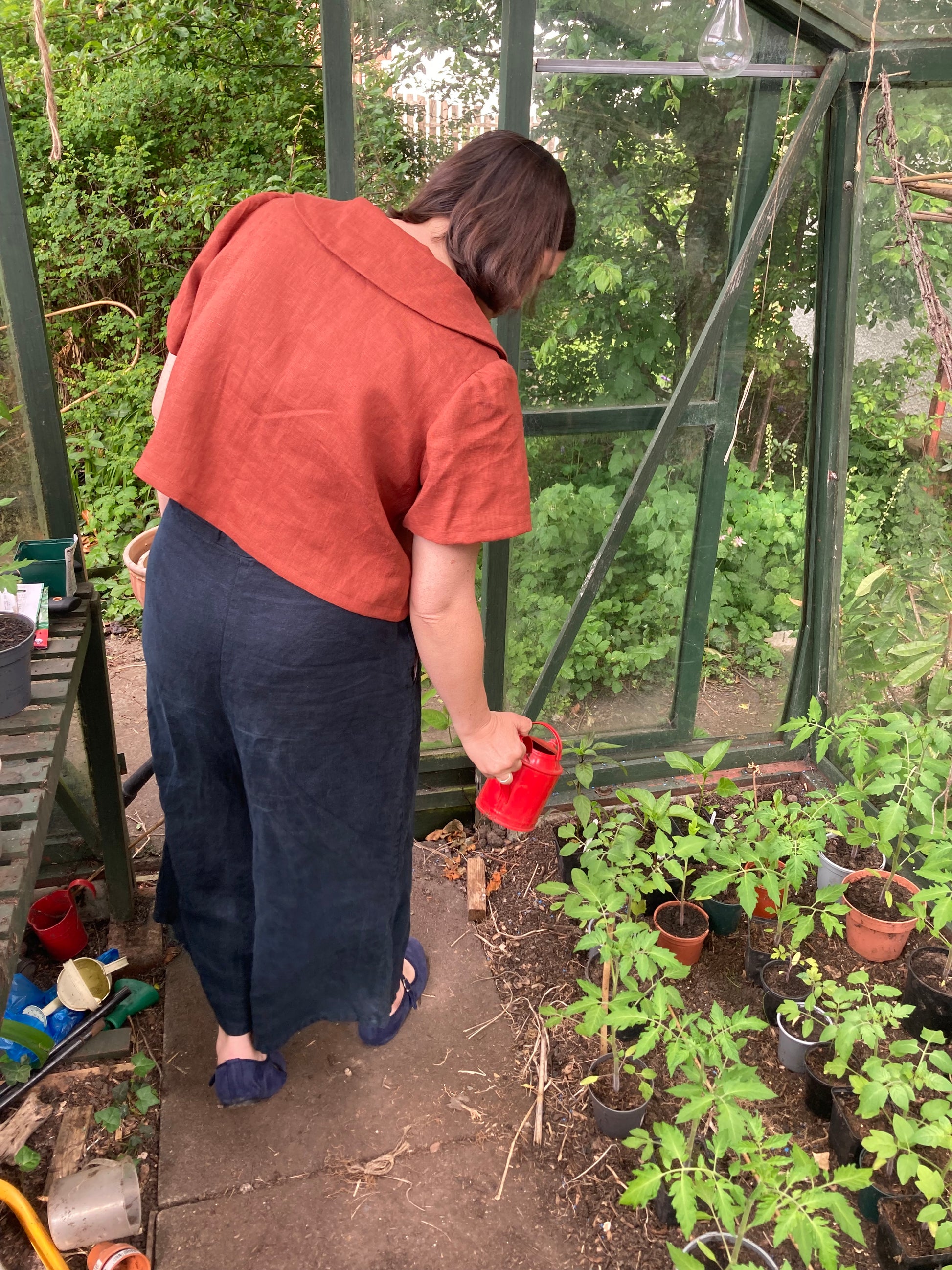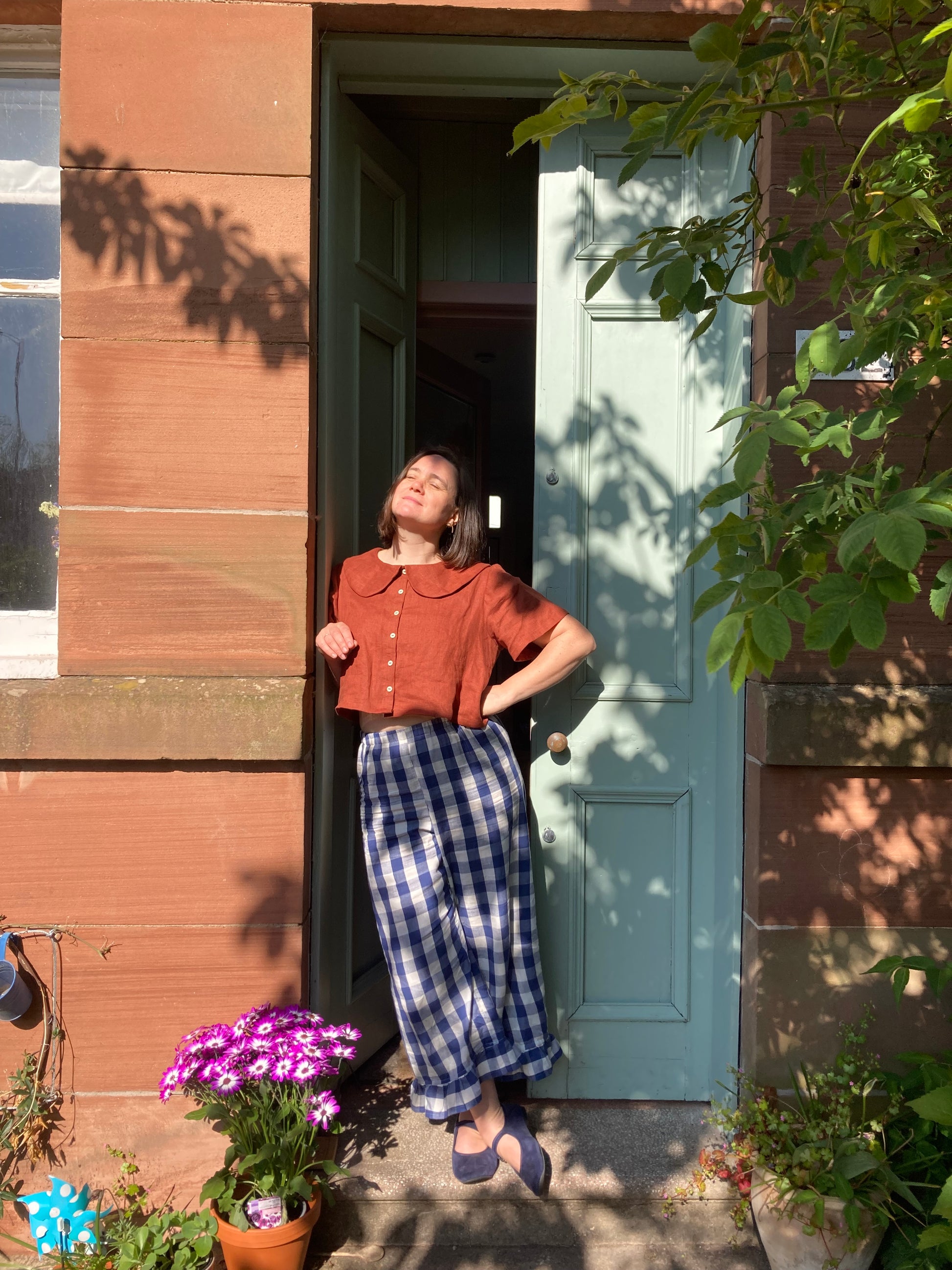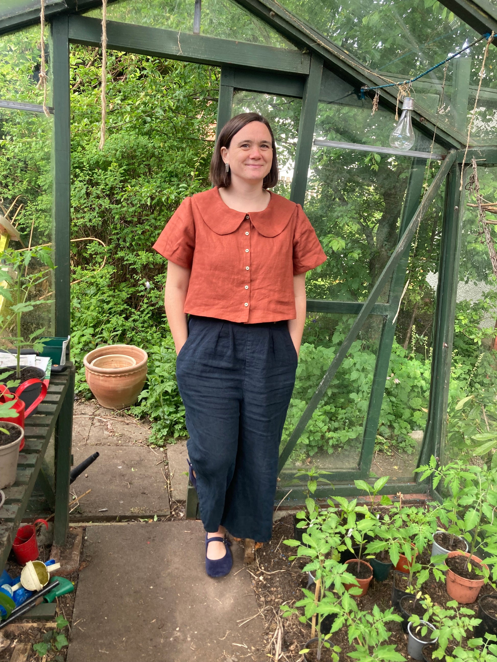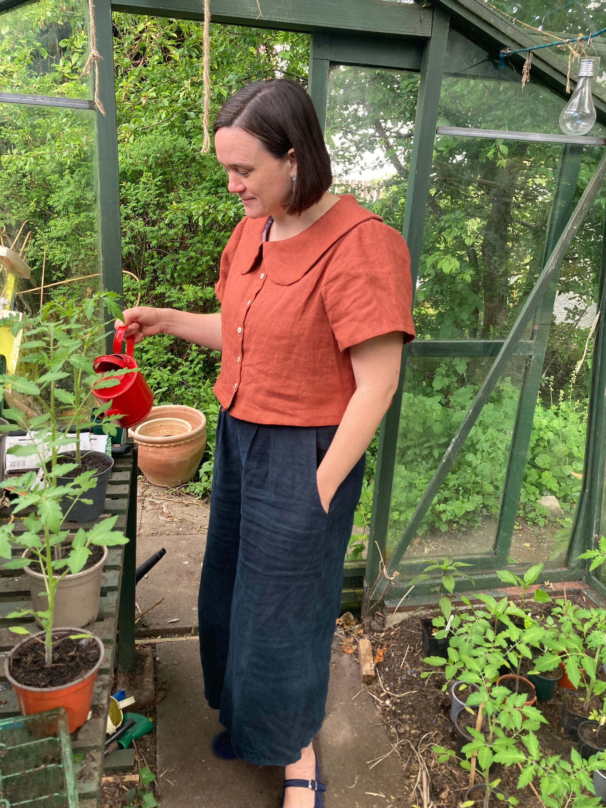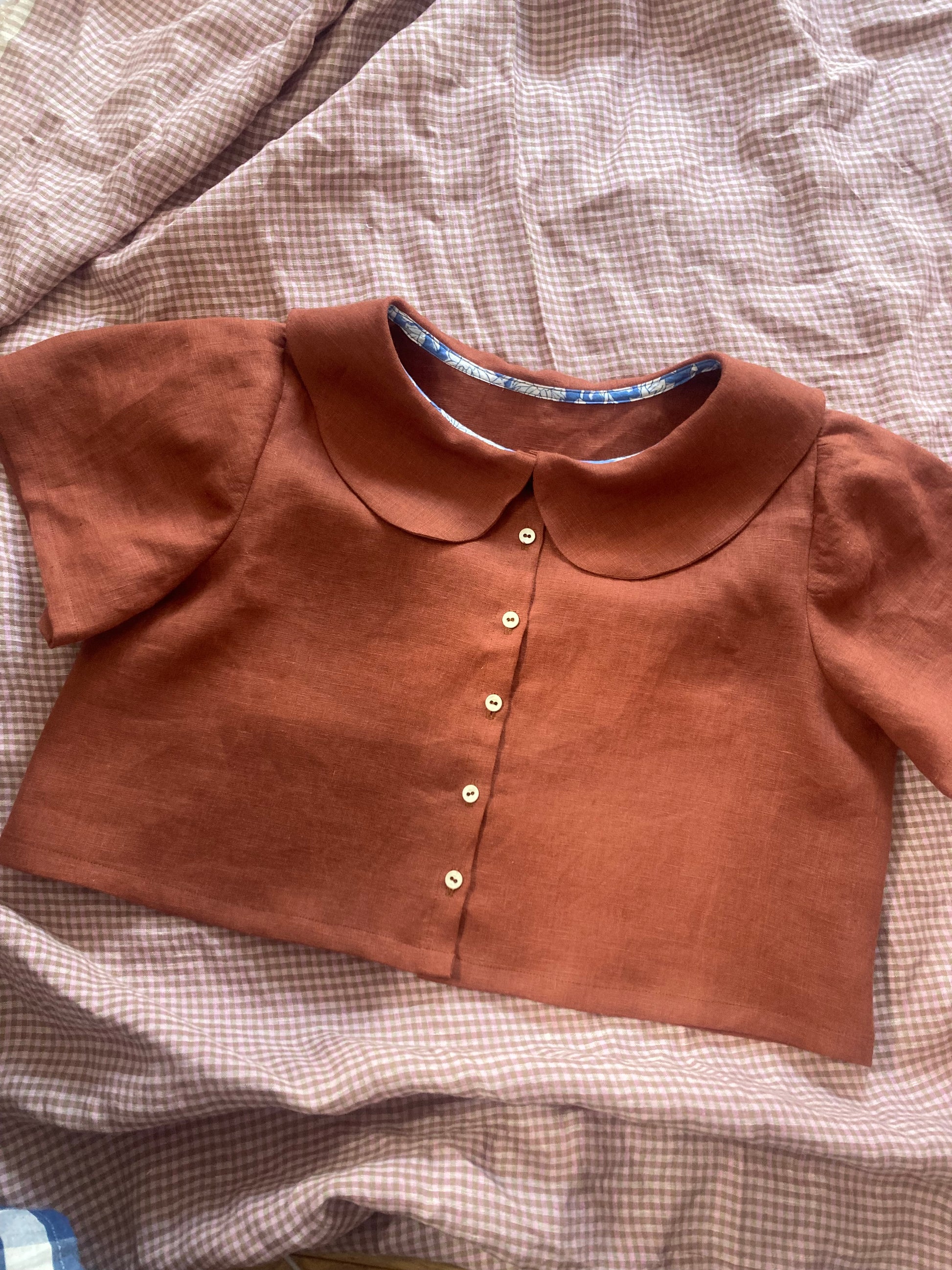 A cute blouse with big collar energy! This is cropped in length with lovely puffed sleeves that will work with everything else in your wardrobe. I haven’t embroidered the sample but it would look excellent with some sleeve or collar embroidery so that’s an option you can add on. Pure linen blouse with vintage buttons. Made with French seams and cotton binding inside to make it extra beautiful.