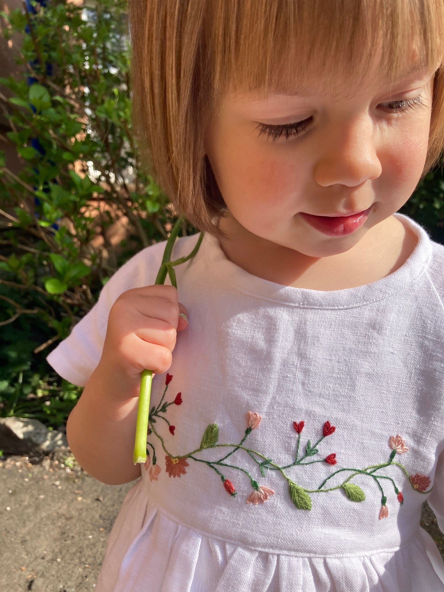 Hand embroidered, lined bodice, can be finished at the neck with a tie or pearl button and completed with a sash at the back or left simple. This dress has many bespoke options so get in touch to discuss personal embroidery - I can match the flowers to a wedding bouquet or colours.
