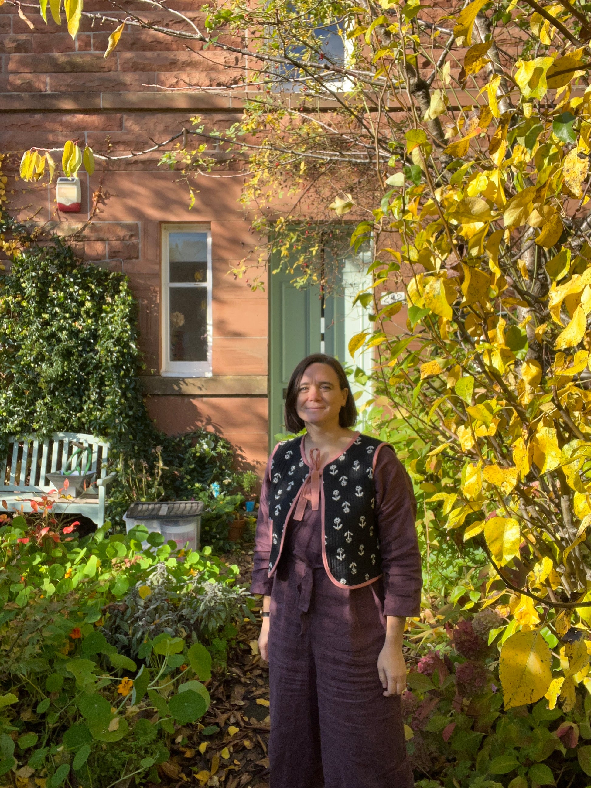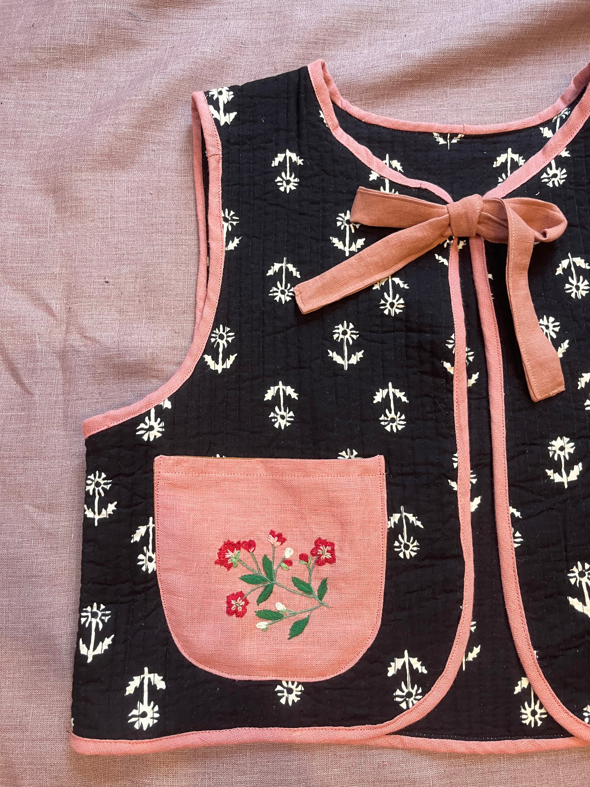 Stunning quilted block printed cotton vest bound with linen. This is a piece to keep you cosy and instantly stylish with hand embroidered pocket and a lovely linen bow to tie.